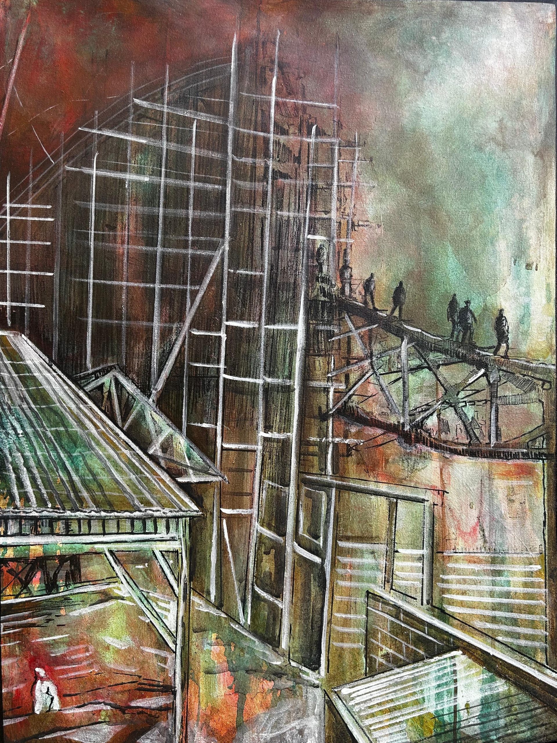 Hamit İzmir’in Gölgeler Köprüsü adlı çalışması, sanayi estetiğini insan varoluşunun kırılganlığıyla birleştiren güçlü bir kompozisyon sunmaktadır. Eserdeki çelik konstrüksiyonlar, yükselen iskeleler ve gövdesi yarım kalmış yapılar, modernleşmenin ve üretim ilişkilerinin simgesel temsilleri olarak okunabilir. Köprü üzerinde yürüyen siluetler, işçilerin anonimleşmiş figürleriyle insanın emeğe ve yapıya eklemlenmesini vurgular.