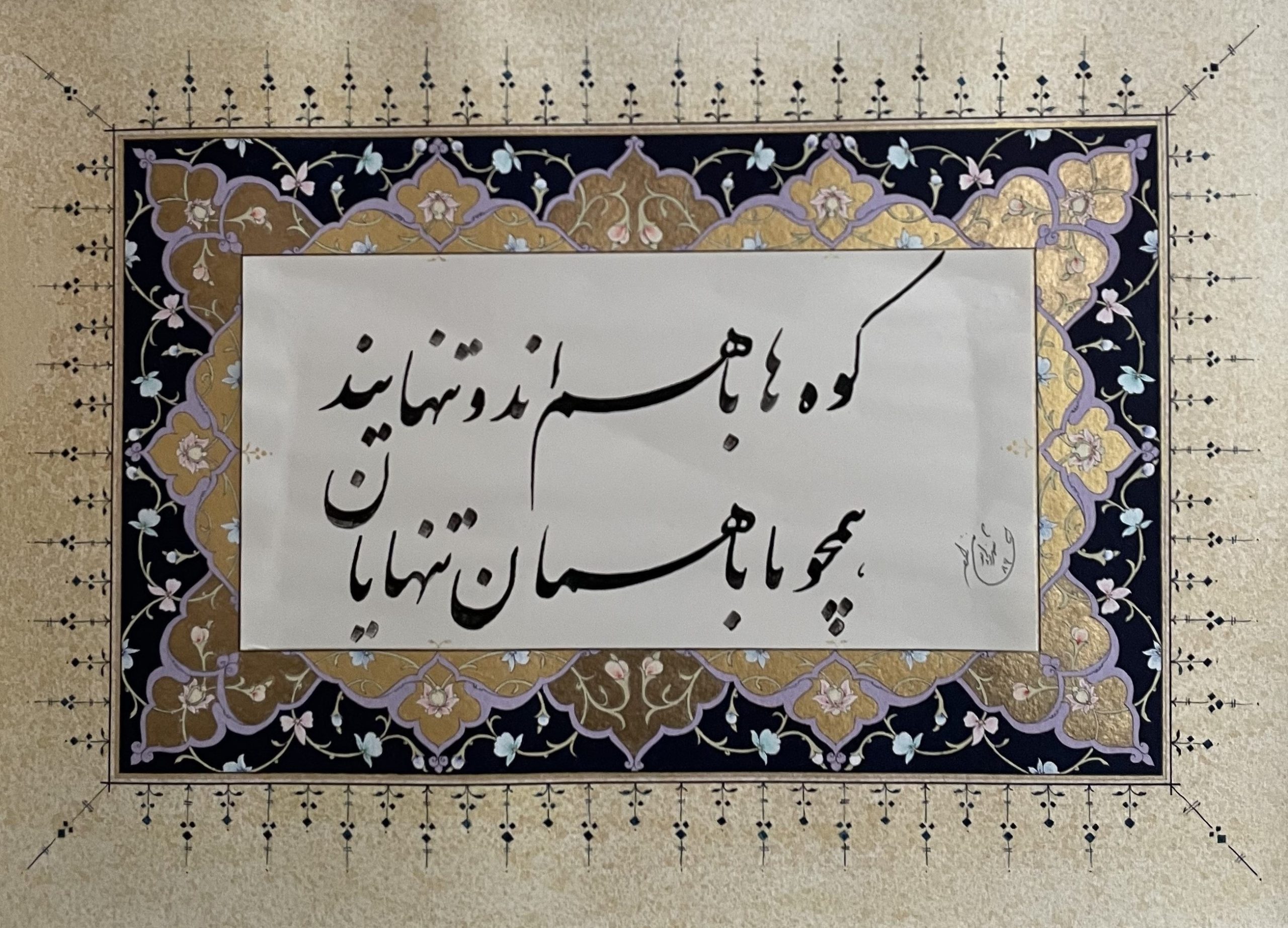 Bu eser, hat sanatı ile tezhibin kusursuz uyumunu zamansız bir düzlemde buluşturuyor. Merkeze yerleştirilen Farsça beyit, Şikeste Talik hattının akışkan ve zarif kıvrımlarıyla adeta hayat bulurken; çevresini saran klasik tezhip motifleri, bu manevi yolculuğa altın parıltılarıyla eşlik ediyor. Geleneksel sanatın sabır ve zarafetle işlendiği bu çalışma, kadim bir kültürün modern bir ruhla yeniden vücut bulmuş hali.