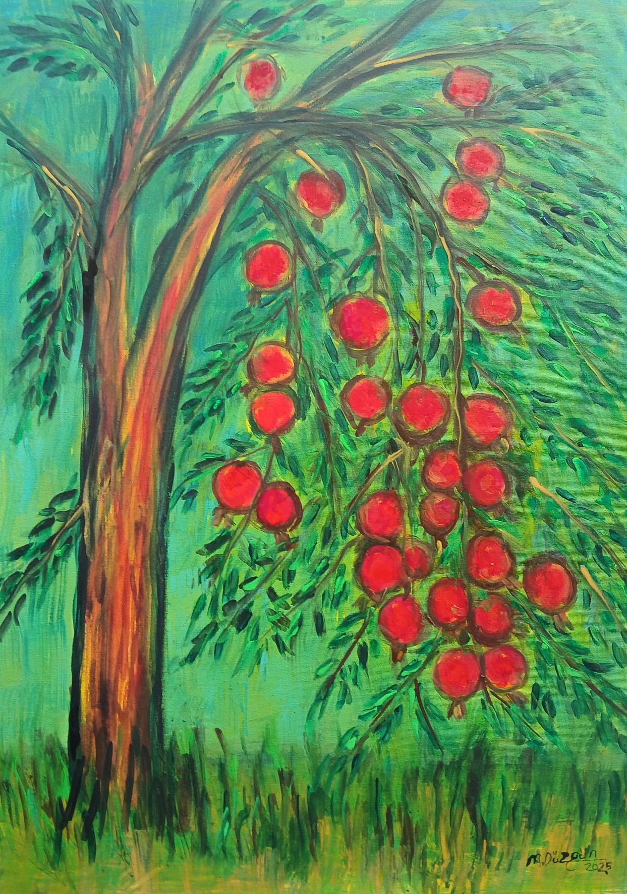 Bu eser, doğanın bereketini ve yaşam döngüsünü simgeleyen nar ağacını merkezine alıyor. Canlı yeşil tonların içinden yükselen kırmızı narlar, hem doğanın coşkusunu hem de hayatın sürekliliğini anlatıyor. Enerjisi ağacın dallarındaki hareketi hissettirirken; renklerin kontrastı izleyiciye güçlü bir görsel etki sunuyor. Nar, Anadolu kültüründe bolluk ve birlik sembolüdür; bu tablo da izleyiciyi doğanın cömertliğiyle buluşturuyor.