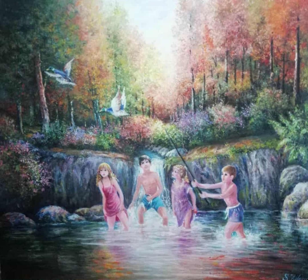 Bu eser, doğa ve insan arasındaki kaybolmuş uyumu çocukluğun saflığı üzerinden yeniden kurar. Sanatçı, pastoral bir sahne içinde suyun akışkanlığıyla ışığın oyunlarını ustalıkla birleştirirken, çocuk figürleri aracılığıyla masumiyetin ve zamansızlığın görsel bir şiirini sunar.