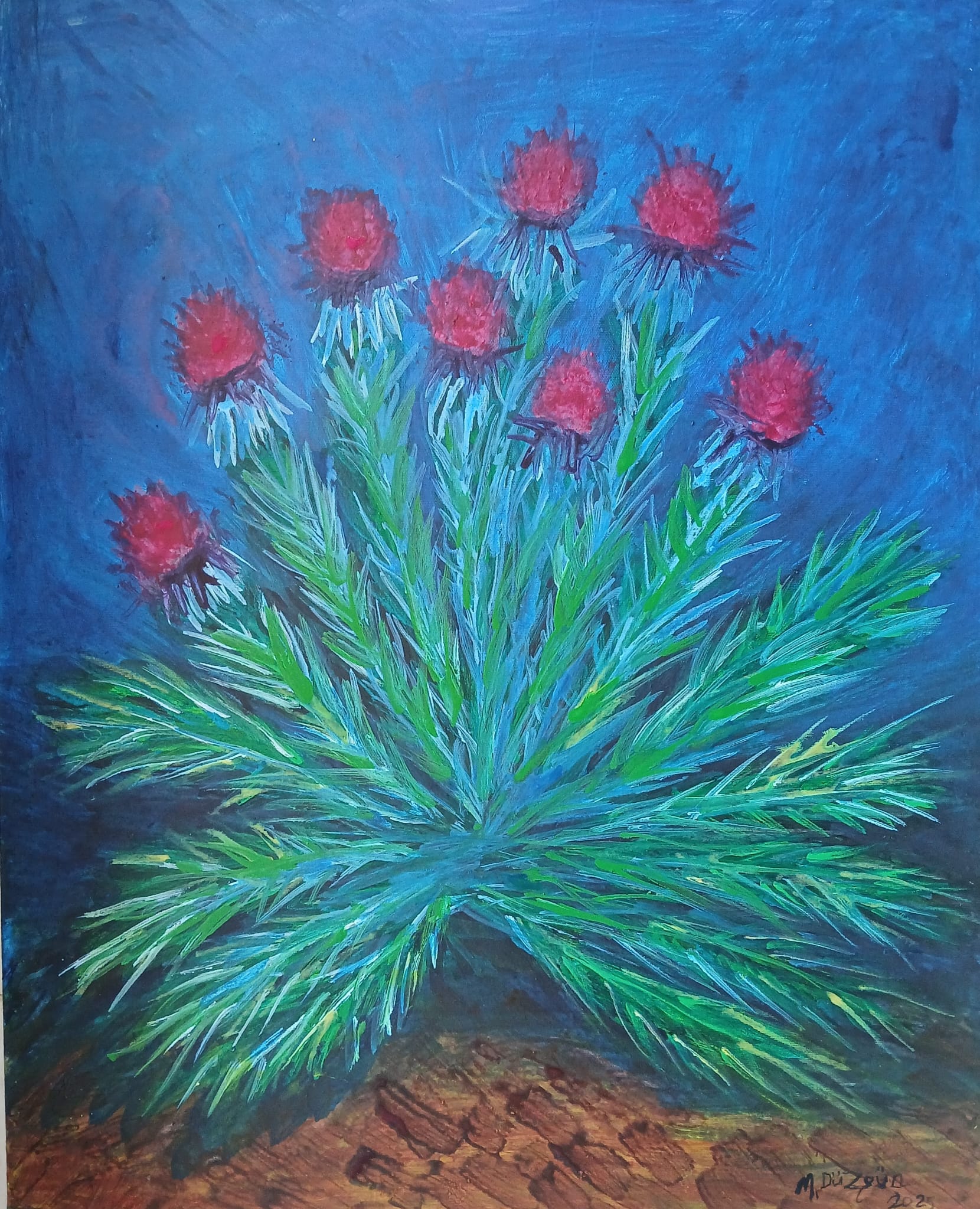 Bu eser, doğanın direncini ve zarafetini aynı anda yansıtan kırmızı çiçeklerin canlı ifadesiyle dikkat çekiyor. Mavi fon üzerinde parlayan yeşil yapraklar ve ateş kırmızısı çiçek başları, hem umut hem de dayanıklılık duygusu uyandırıyor. Sanatçı, renklerin kontrastını ustalıkla kullanarak, izleyicide doğanın gücünü ve içsel enerjisini hissettiren bir görsel şiir yaratıyor.
