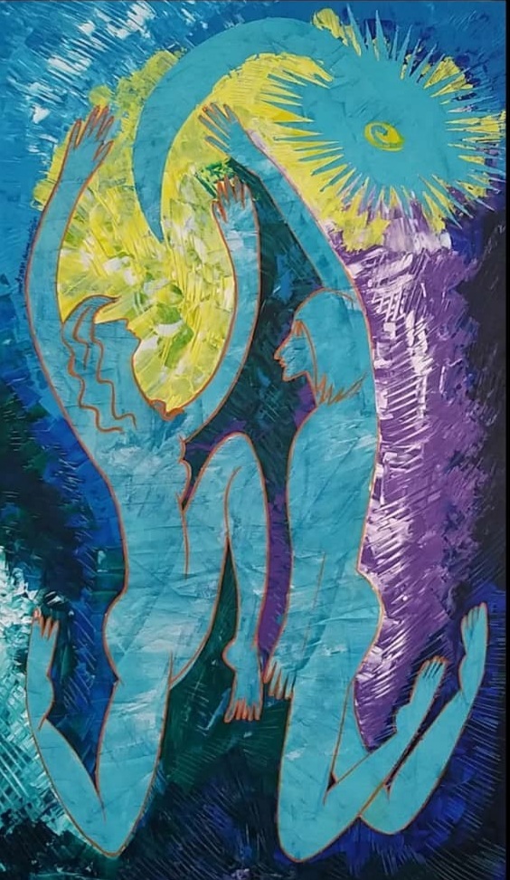 Mavi tonlarındaki bedenlerin hareketindeki özgürlük, sarı ve yeşil ışık patlamalarıyla birleşerek, yaşamın dönüştürücü enerjisini ve umut dolu arayışını yansıtıyor. Mor ve lacivert arka plan ise hem derinliği hem de içsel mücadeleyi hatırlatıyor.