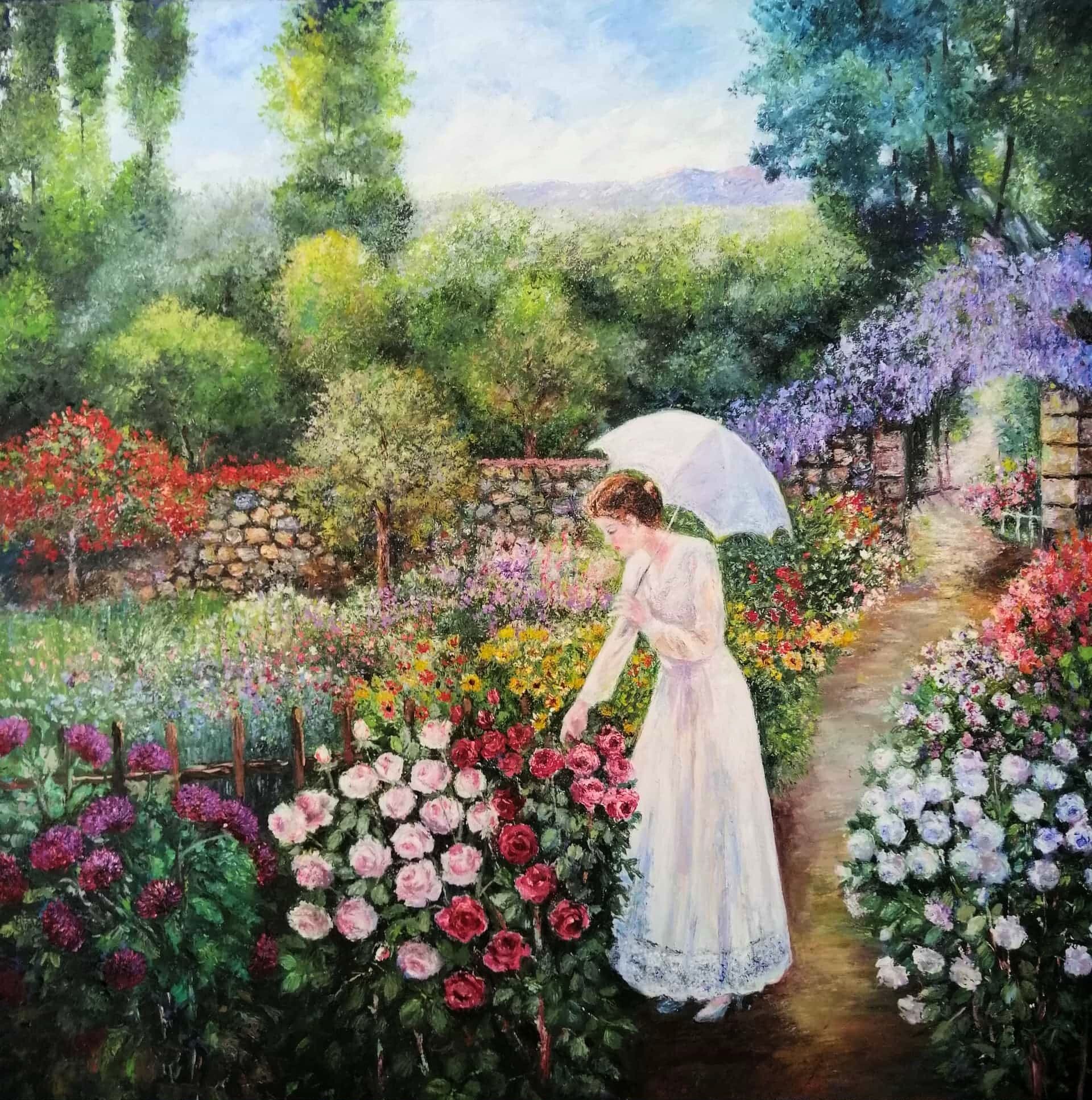 Bu eser aracılığıyla doğanın sade şiirsel ifadesiyle karşılaşıyoruz. Spatül tekniğiyle yaratılan yüzey dokuları, renk geçişlerindeki canlılık ve ışığın tablonun her noktasına yayılışı, resme dinamik bir derinlik kazandırıyor. Kadın figürünün mevsim ile doğa arasında duruşu, izleyiciye hem huzur hem de merak duygusu sunuyor.