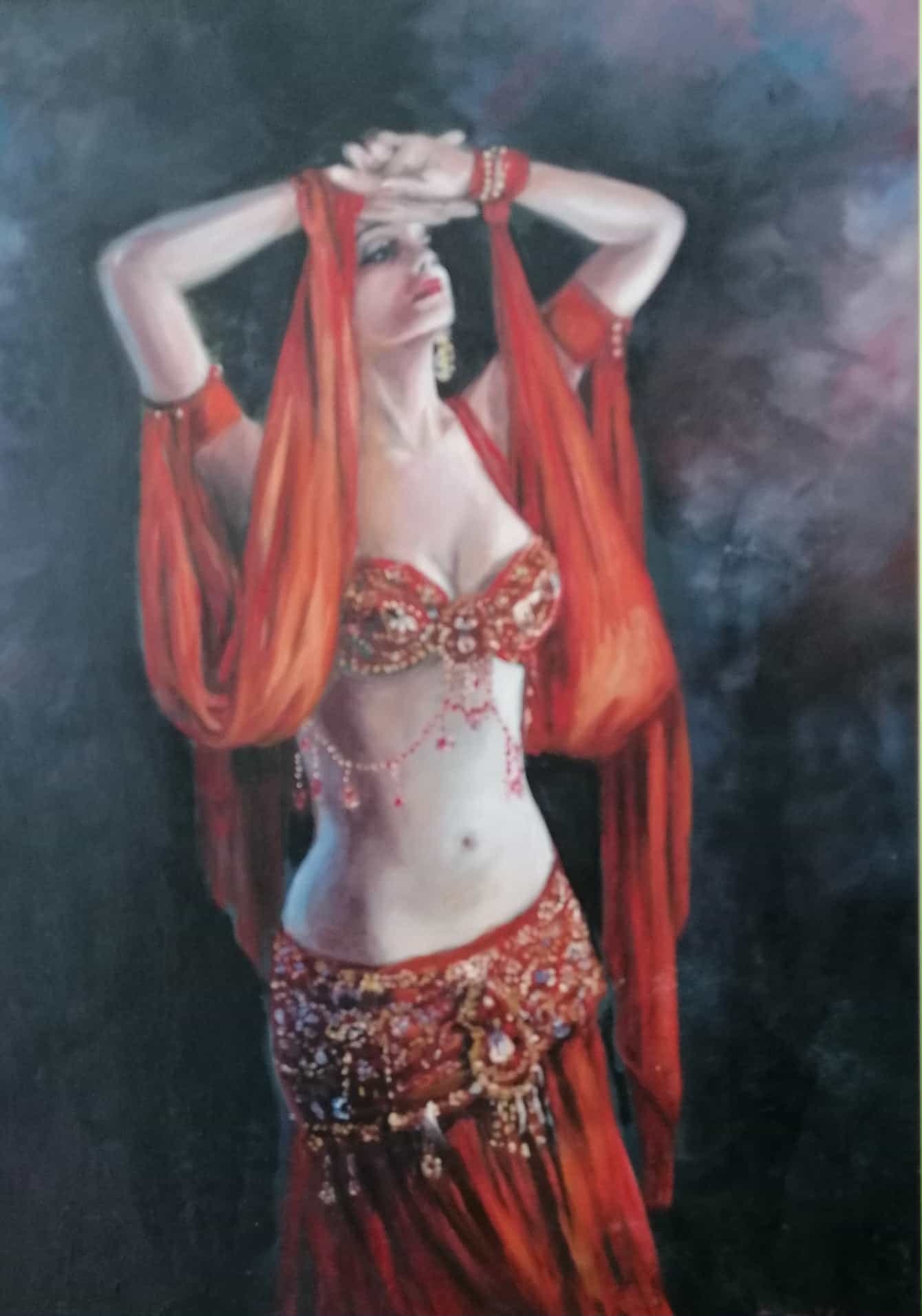 Süleyman Zilayaz’ın bu eseri, hareket ve duygunun sınırında duran bir figürü büyüleyici bir ışık düzeniyle resmediyor. Sanatçı, kırmızının tutku ve enerjisini figürün bedensel ifadesiyle birleştirerek hem zarif hem de güçlü bir estetik etki yaratmış. Gövde hatlarındaki ritim, kumaşın dalgalanışı ve bakıştaki özgüven, izleyeni sessiz bir dansın içine çekiyor. Zilayaz, bu eserde kadın bedeninin estetik zarafetini, içsel bir özgürlük ve sahne duygusuyla ustaca harmanlıyor.