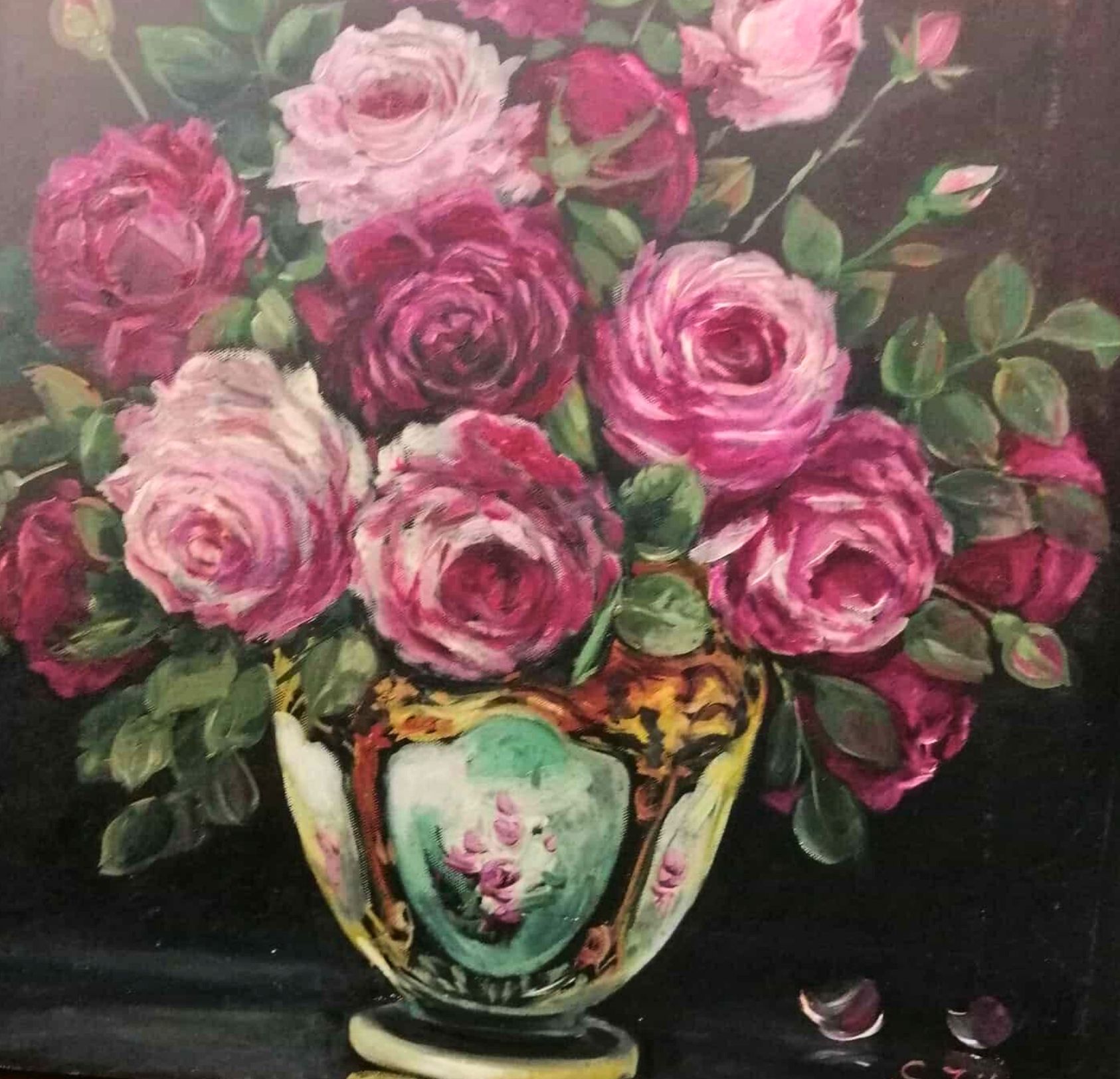 Süleyman Zilayaz’ın bu eseri, klasik natürmort geleneğini güçlü bir renk duyarlılığıyla yeniden yorumluyor. Yoğun pembe ve kırmızı tonlarla resmedilen güller, hem tazelik hem de zarafet duygusu uyandırıyor. Sanatçı, ışık ve gölge geçişlerinde ustaca bir denge kurarak çiçeklerin dokusunu neredeyse dokunulabilir bir gerçekliğe taşıyor. Kompozisyon, yaşamın geçiciliğine karşı estetiğin kalıcılığını hatırlatan zarif bir görsel şiir niteliğinde.