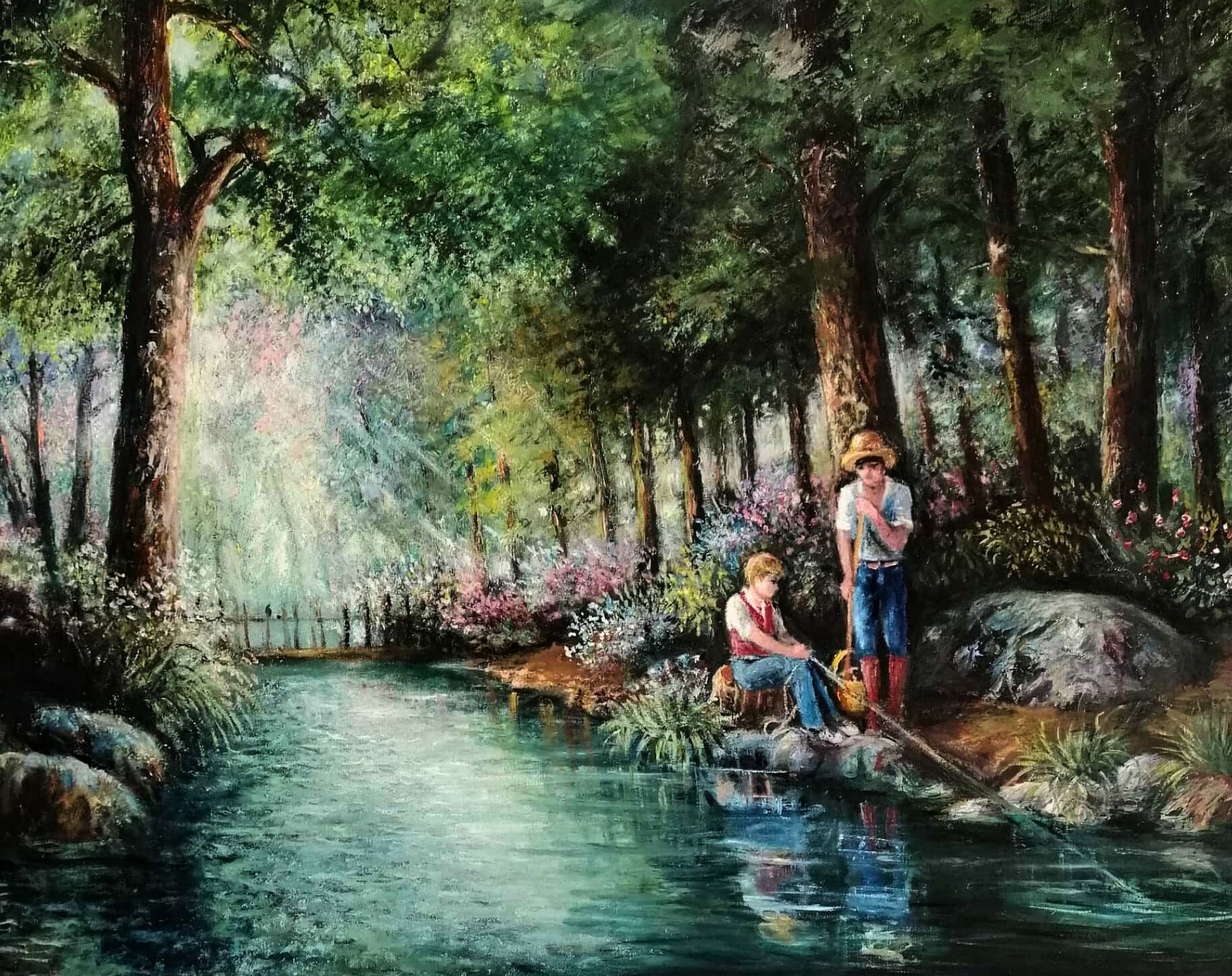 Süleyman Zilayaz’ın bu eseri, doğanın huzurunu ve çocukluğun masumiyetini aynı karede buluşturuyor. Işığın ormandan süzülüşü, suyun sakin yüzeyi ve figürlerin sade duruşu, izleyiciye pastoral bir dinginlik hissi veriyor. Sanatçı doğayı, insan ruhunun sığınağı olarak yorumluyor.